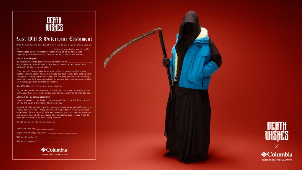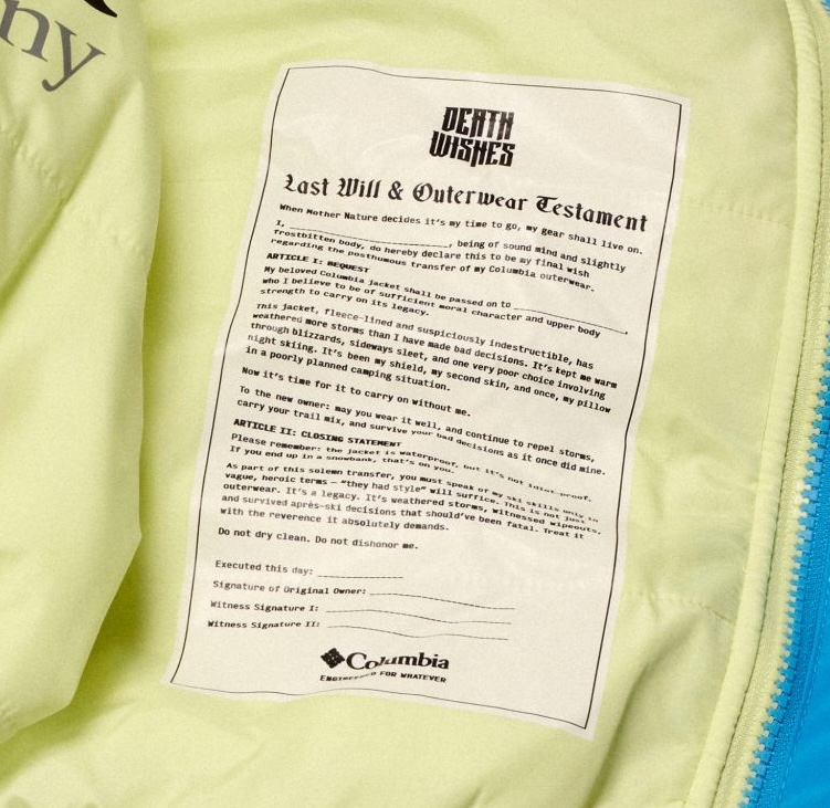 As part of its bold new campaign “Engineered for Whatever,” Columbia Sportswear has taken the concept of product durability to its absurd conclusion: a “Last Will & Outerwear Testament” stitched into the lining of select jackets.