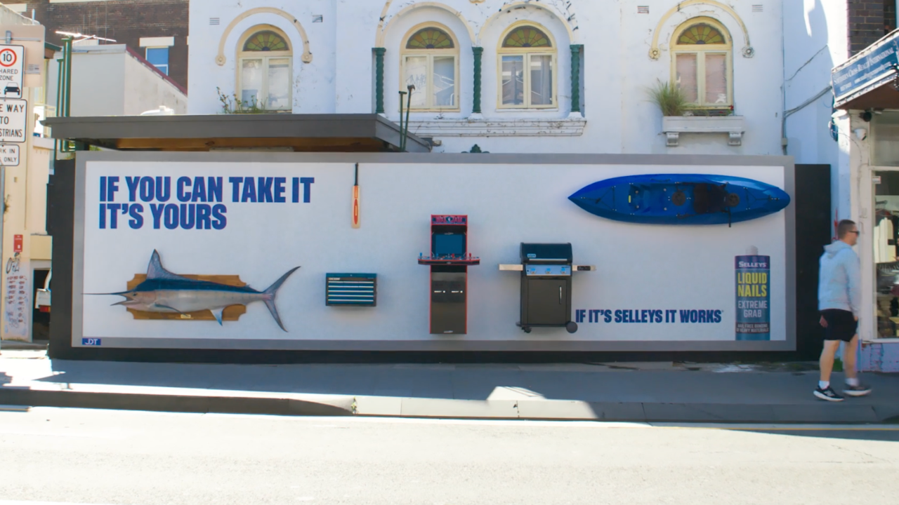 Selleys have put their famous Liquid Nails to the ultimate test — by gluing a range of objects, including a kayak, an arcade machine and a 2.8-metre marlin, to a outdoor billboard and inviting the public to try and take them.