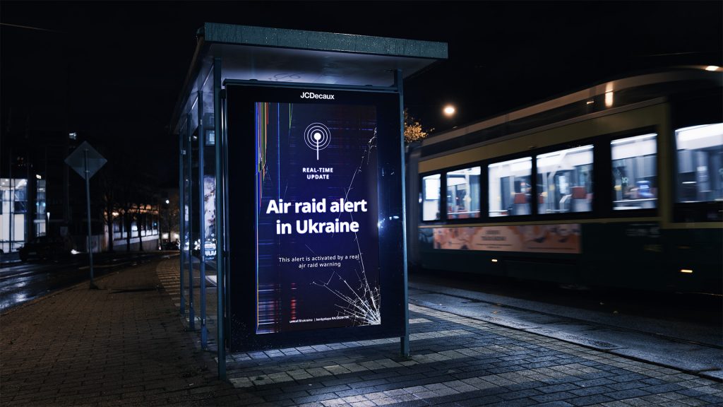 The campaign, which taps into data from Ukraine’s official Air Alarm app, covers alerts from six major Ukrainian cities and instantly triggers messages across digital billboards whenever a siren sounds.