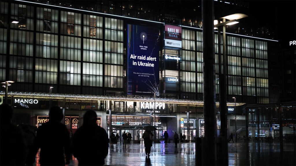 In a stark reminder that Ukraine’s war is far from over, UNICEF Finland has launched a campaign that streams real-time air raid alerts from Ukraine to outdoor advertising screens across Helsinki.