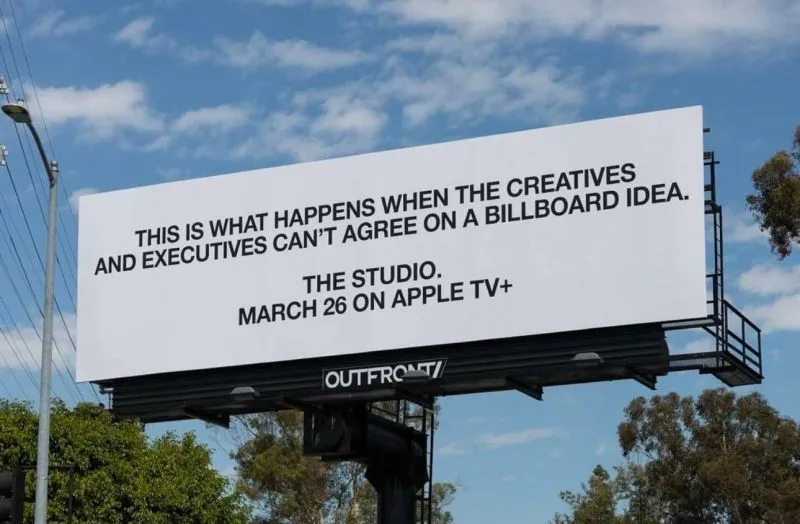 How do you promote a TV show that’s all about juggling corporate demands with creative ambitions? A Hollywood billboard for Apple TVs ‘The Studio’ reads ‘This is what happens when the creatives and executives can’t agree on a billboard idea.’