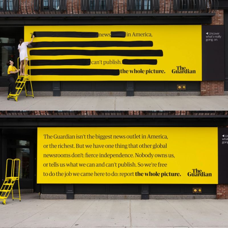 The Guardian doubled down on its US footprint with its first major stateside campaign. On a billboard installed in New York, the publication invites passersby to “remove the censorship” stickers to reveal its message. By Lucky Generals.