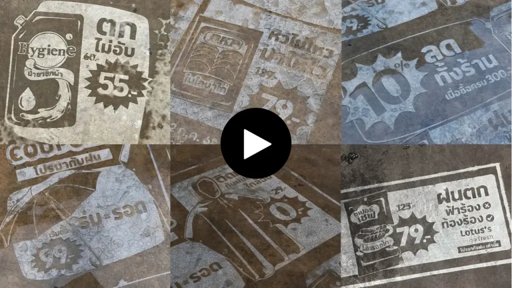 Supermarket chain Lotus’s has launched a creative campaign designed to make Thailand’s intense rainy season a little more rewarding. Using waterproof spray technology, agency VML stencils large coupons onto the pavement in front of its Go Fresh stores.