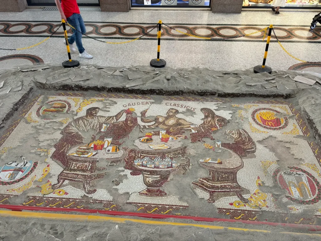 In a bold bit of trolling the fast food giant unveiled a fake ancient Roman mosaic in the Galleria Alberto Sordi that features toga-clad figures feasting on fries and Big Macs.