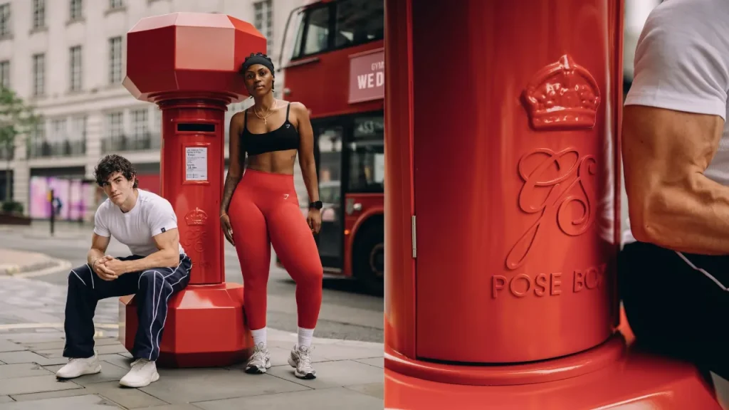 Gymshark promotes upcoming London LIFT event with dumbbell postbox (aka ‘Pose Box’) street installation.