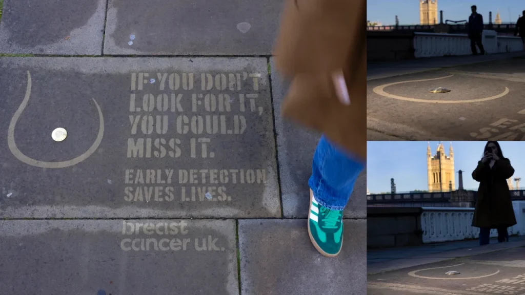 Breast Cancer UK marked awareness month with an eye-catching street stunt: “Street Nipples”, launched in cities across the UK. The campaign uses reverse graffiti — pressure-washing pavements through breast-shaped stencils — to turn overlooked pavement studs into playful but pointed reminders about the importance of early detection.