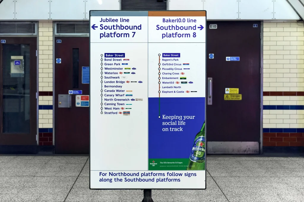 TfL has temporarily rebranded the Bakerloo line as the “Bakerl0.0” to mark a new campaign with Heineken 0.0 – complete with free alcohol-free beers and signage changes across the network.