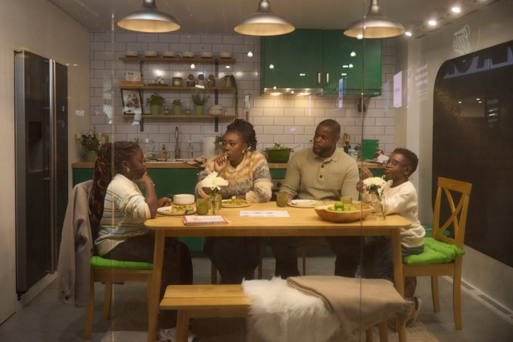 The build reimagines a HelloFresh delivery box as a full-size kitchen, complete with a real family inside preparing and sharing dinner each evening from 5pm.