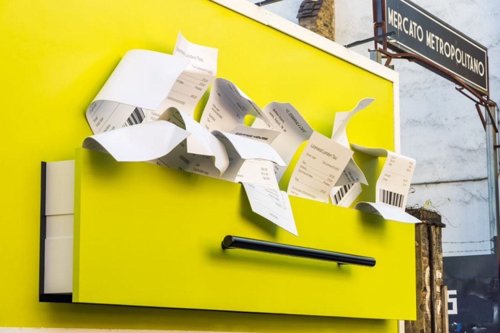 The special build, devised by Talon, Evolve OOH and Goodstuff, features a drawer overflowing with paper receipts, sticking out from a bold yellow backdrop.