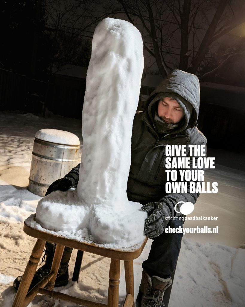 It’s a knob gag with a serious message if you’ve got time to shape snow genitals, you’ve got time to check yourself for early signs of testicular cancer.