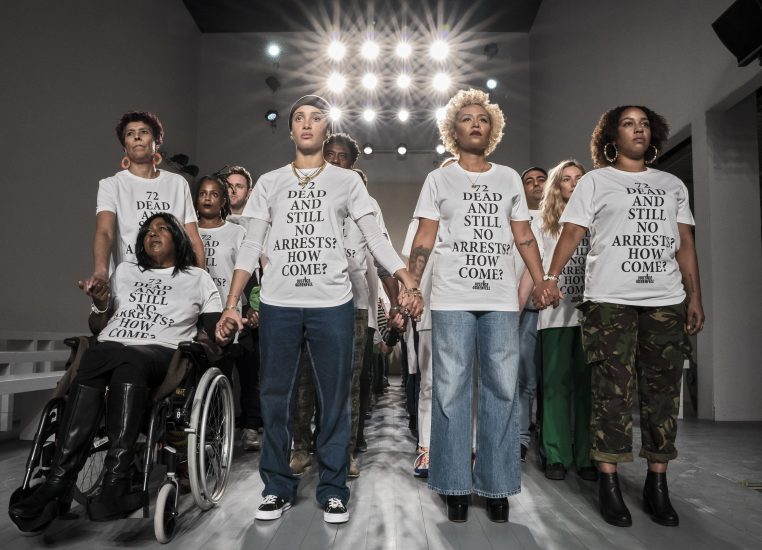 Justice4Grenfell activists protest at London Fashion Week