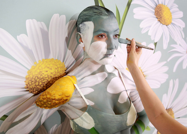 Daisy Lowe blends into the background in Samsung’s body paint illusion
